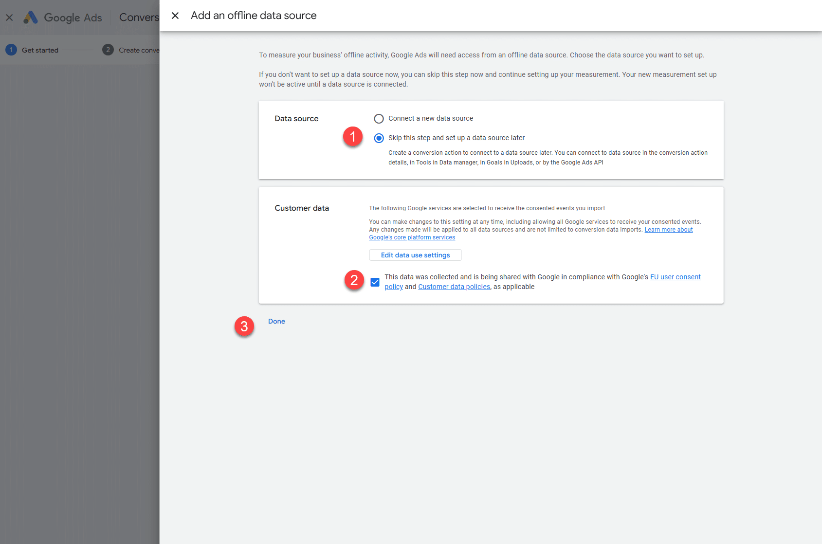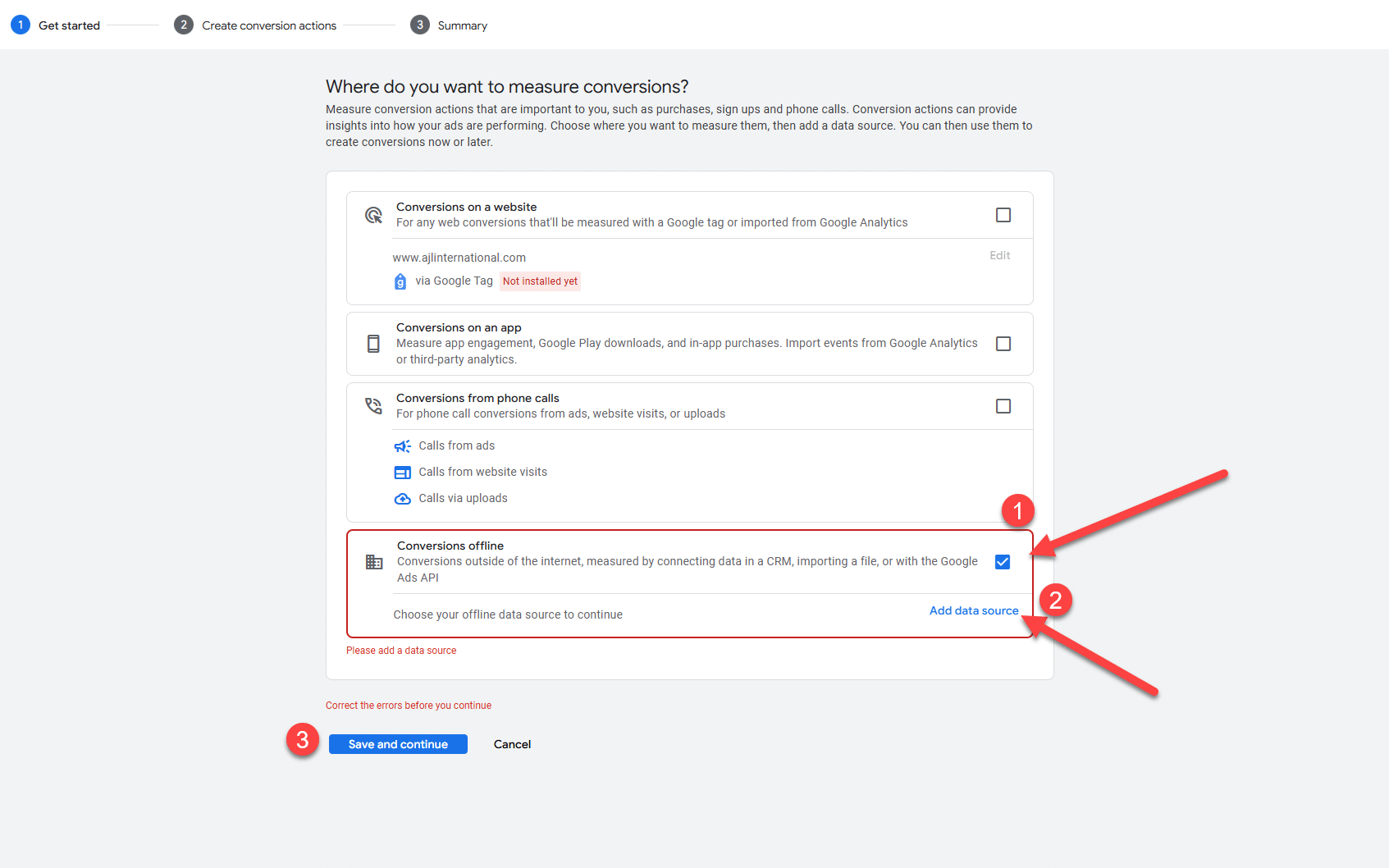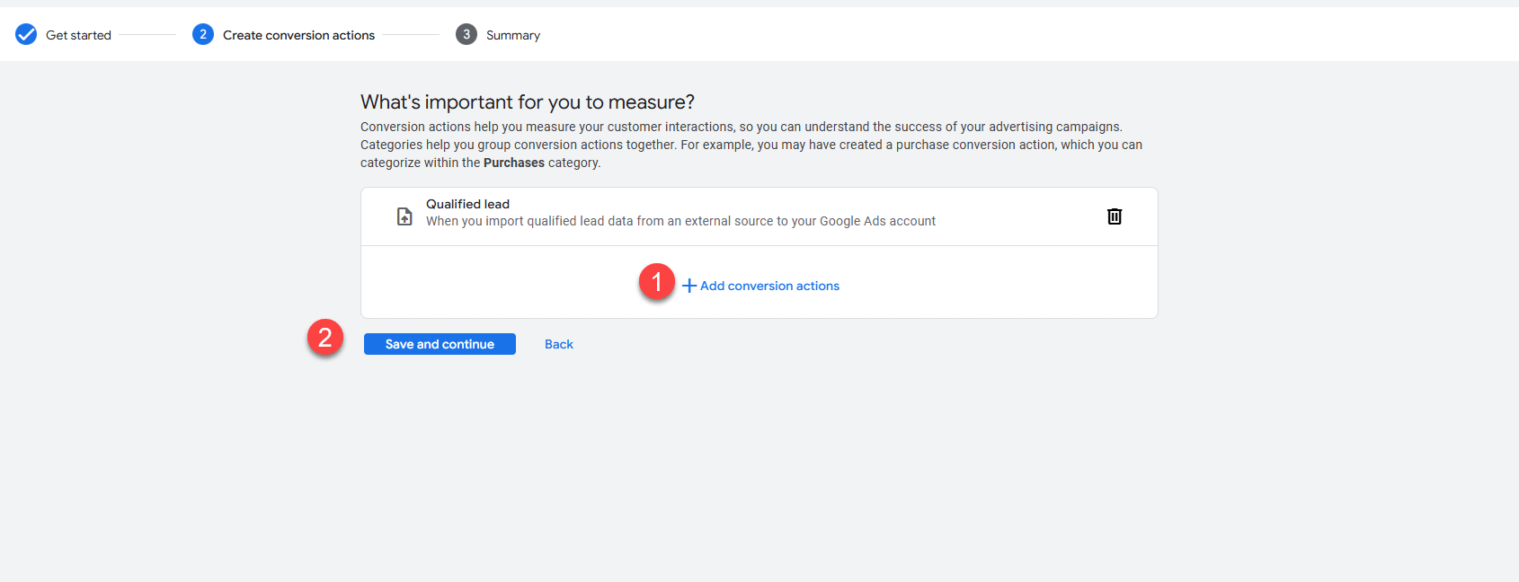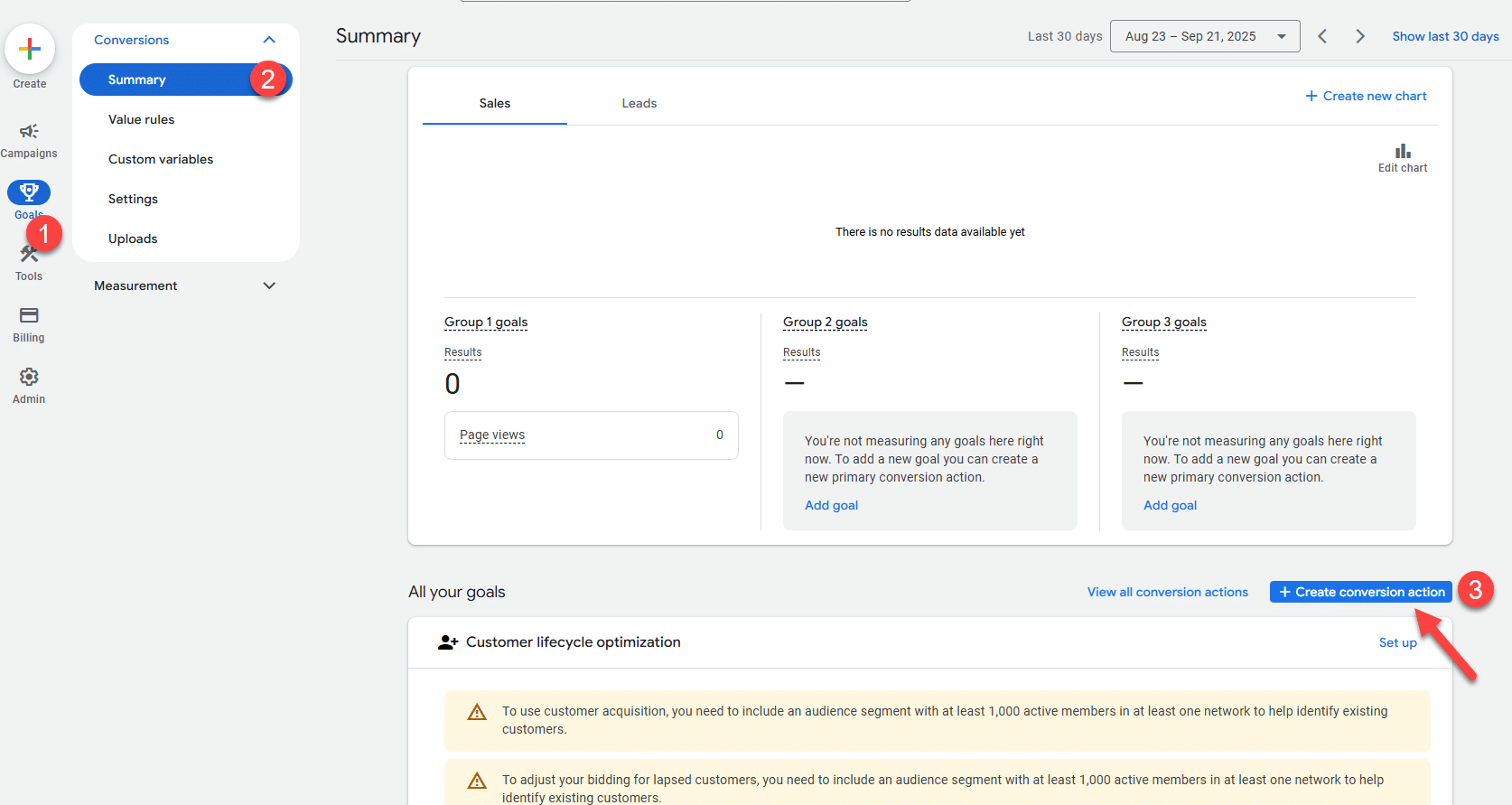1. In the Google Ads account, go to Goals -> Summary and click the + Create conversion action