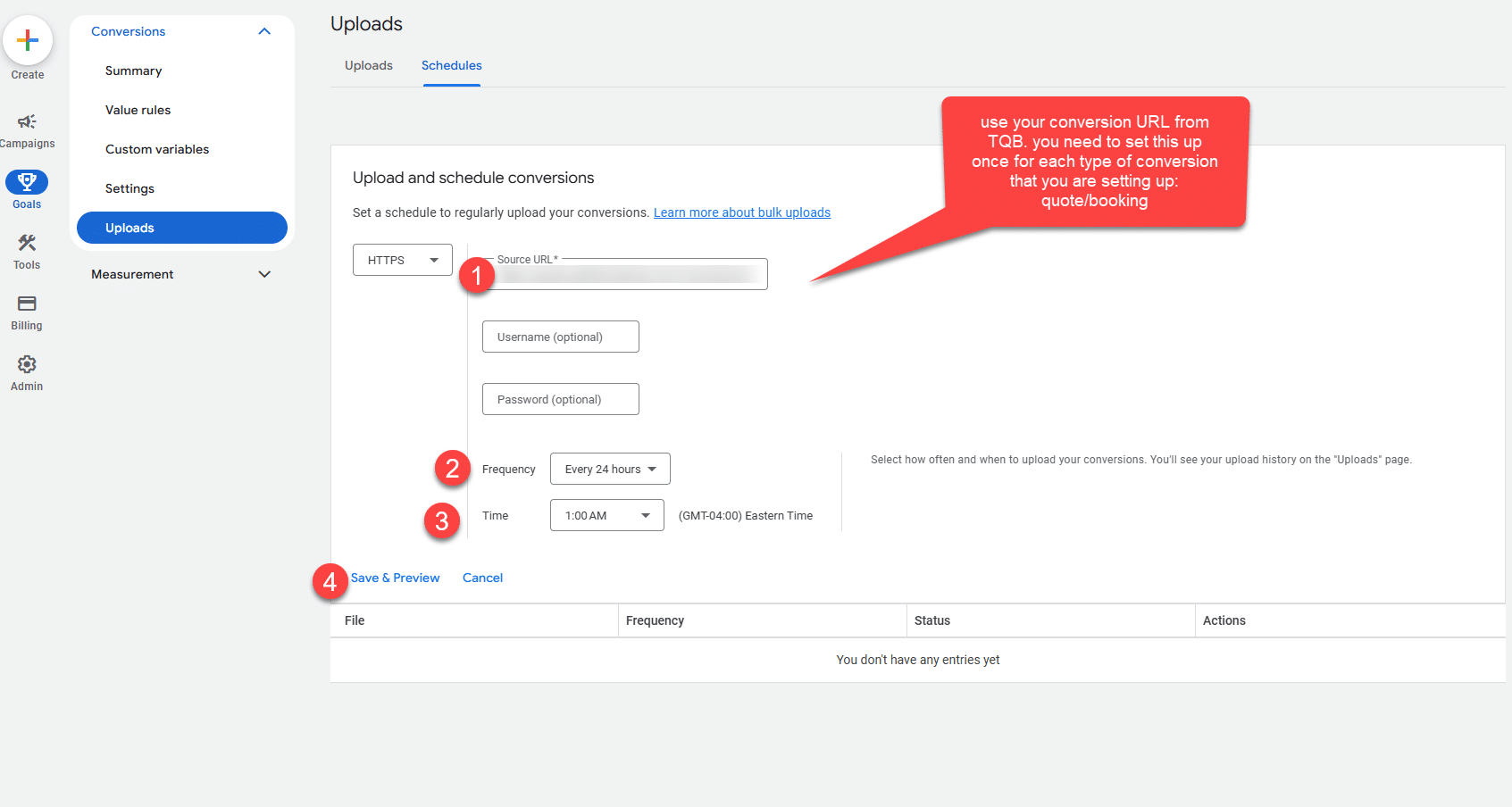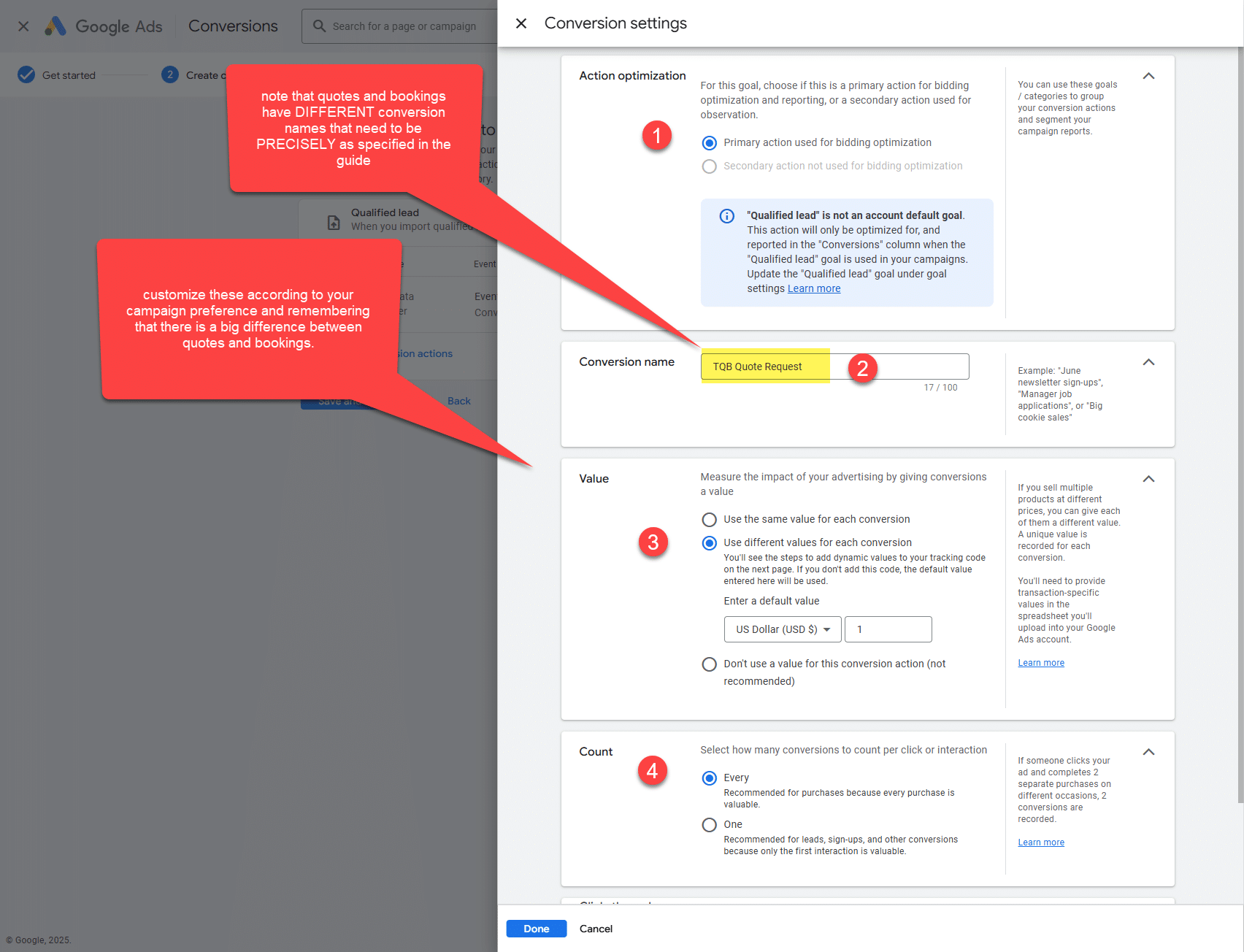 For Conversion Name, you MUST use the following names: “TQB Quote Request” for quotes and “TQB Booking” for bookings. no spaces, no changes.