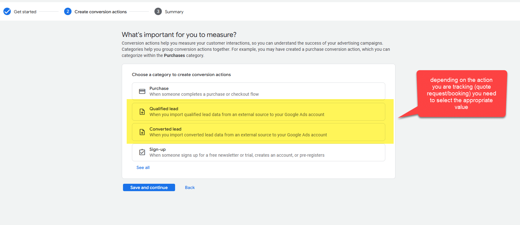 4. Select the correct option for the type of conversion that you are setting up (quote/booking) Then Save and Continue.