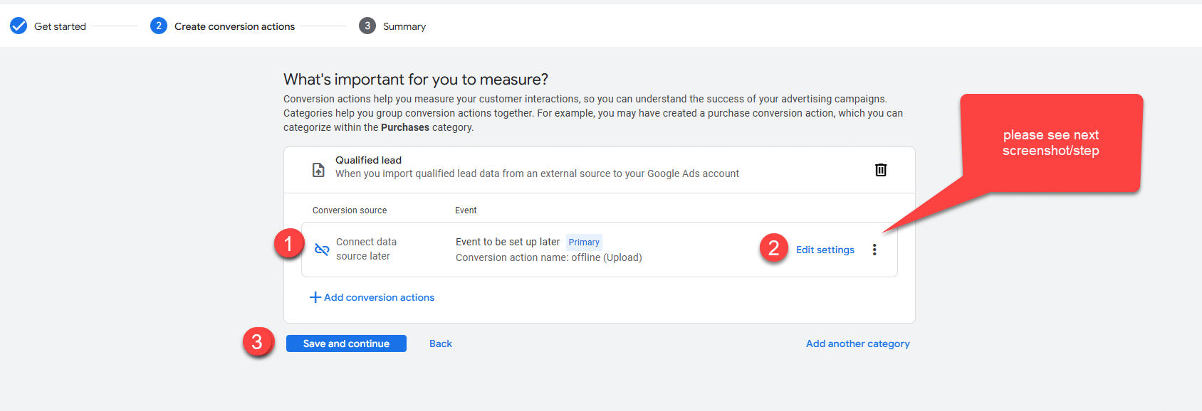 5. Add conversion action, select the “connect data source later” and Edit Settings;
